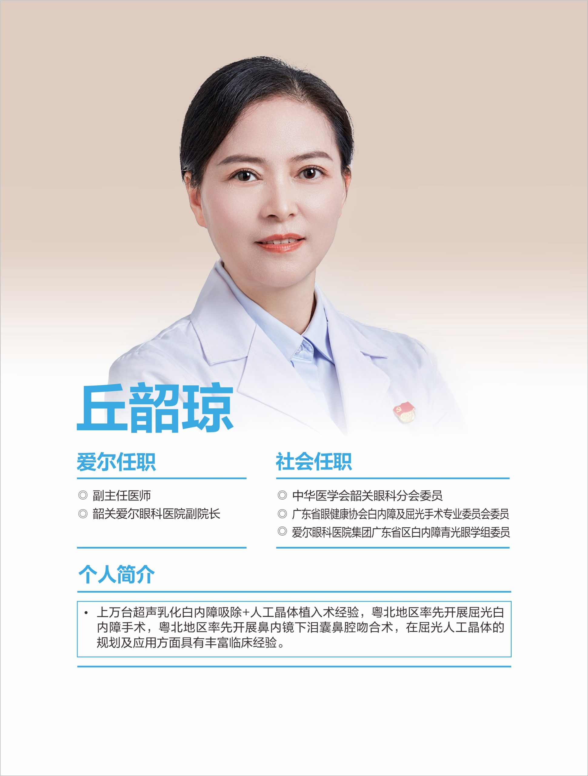 韶關愛爾眼科醫(yī)院有限公司白內(nèi)障團隊擁王愛琴院長(愛爾眼科粵北區(qū))、丘韶瓊院長、郭俊豪主任等多位專科醫(yī)生,具備同步國際的白內(nèi)障手術能力,能熟練開展各項常規(guī)及疑難白內(nèi)障手術。 可開展微切口煥晶白內(nèi)障手術,植入多焦晶體或多焦+散光矯正晶體,在治療白內(nèi)障同時同步解決遠視/近視、老花眼、角膜散光等屈光問題,醫(yī)生手術經(jīng)驗豐富,為眾多患者帶來更舒適的視覺。